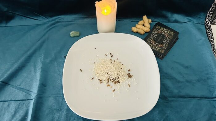 โข Light the white candle and leave it next to the plate for fifteen minutes, extinguishing it after 15 minutes.